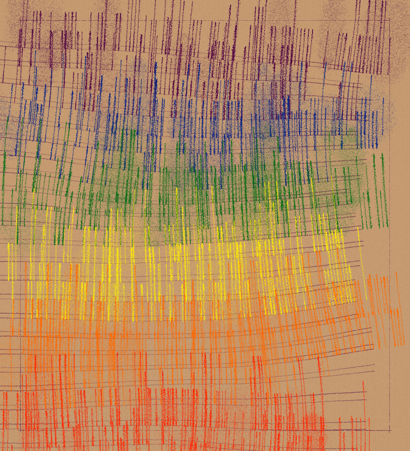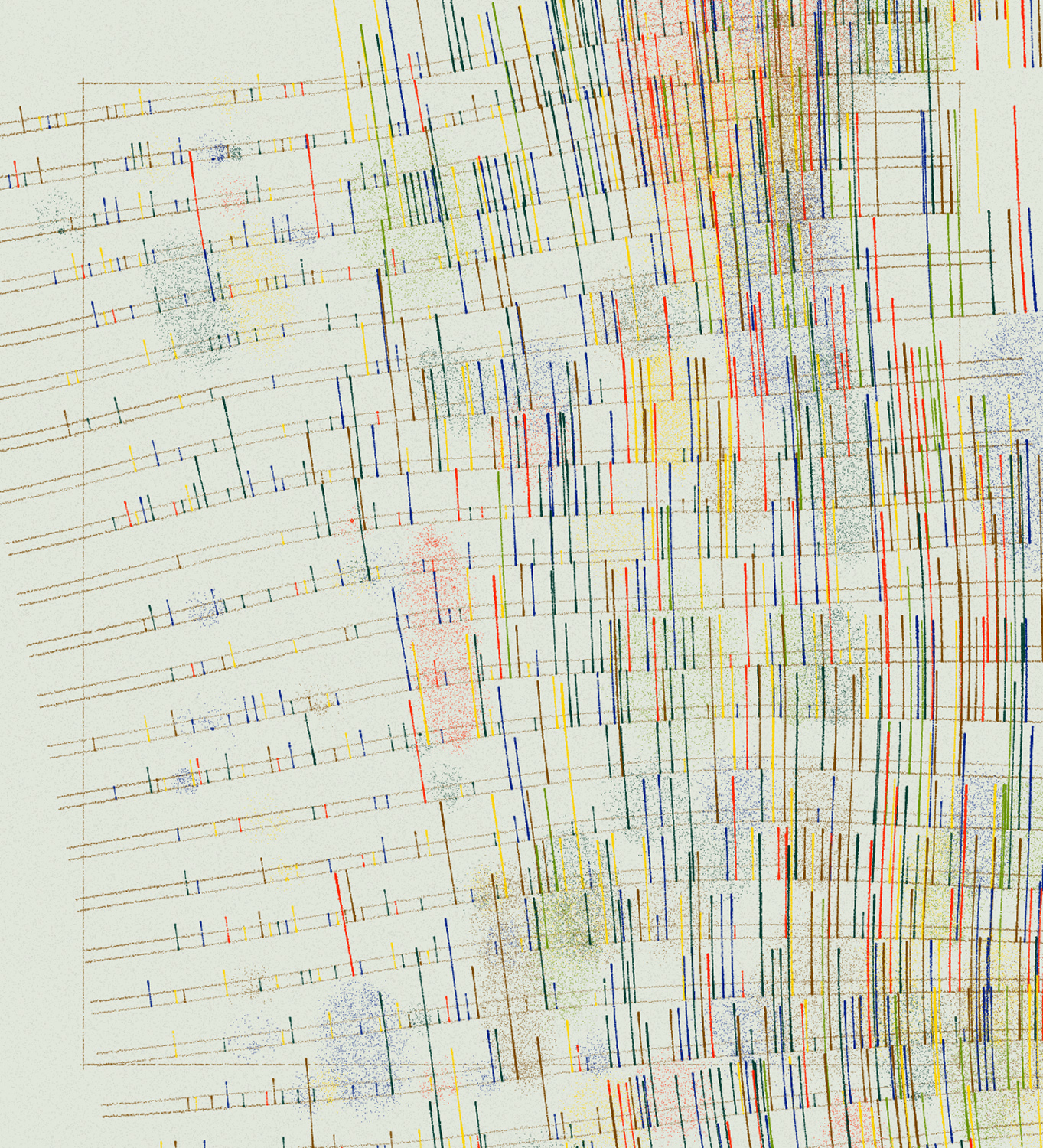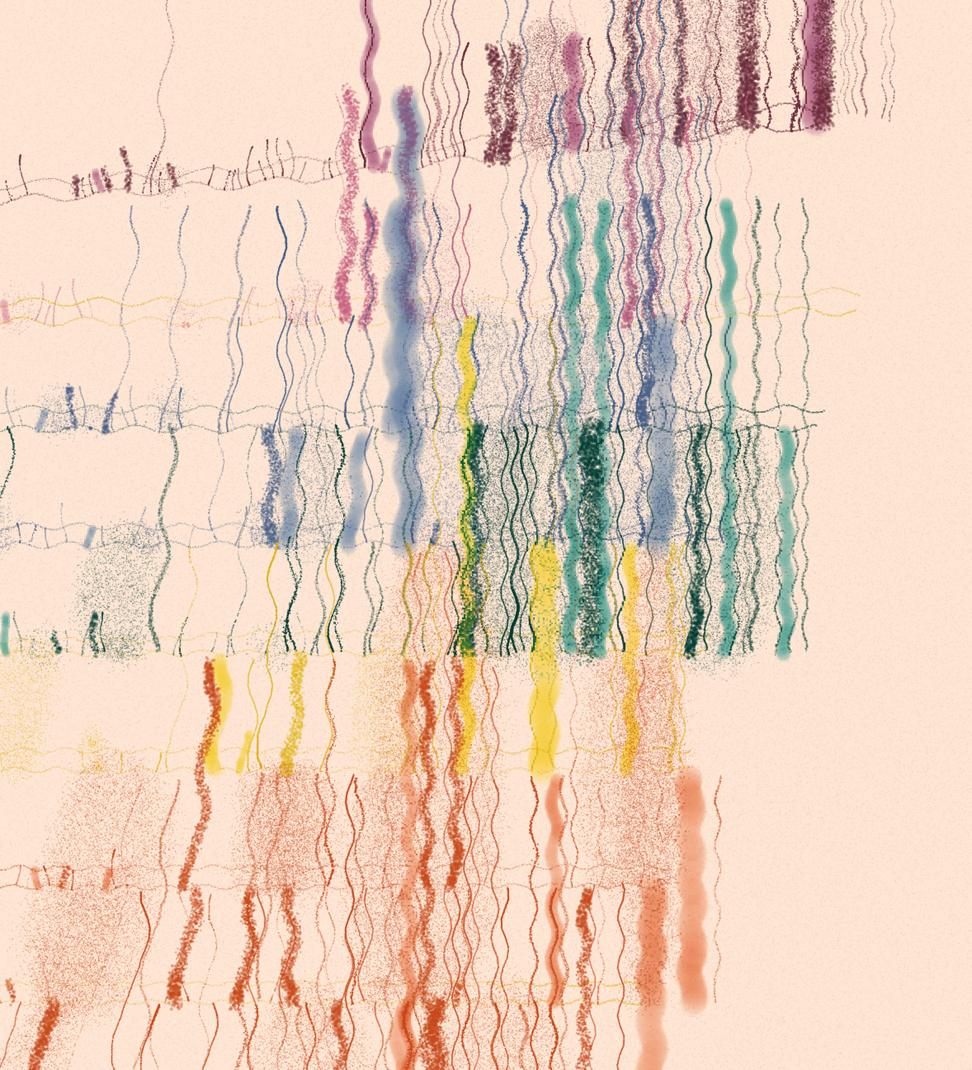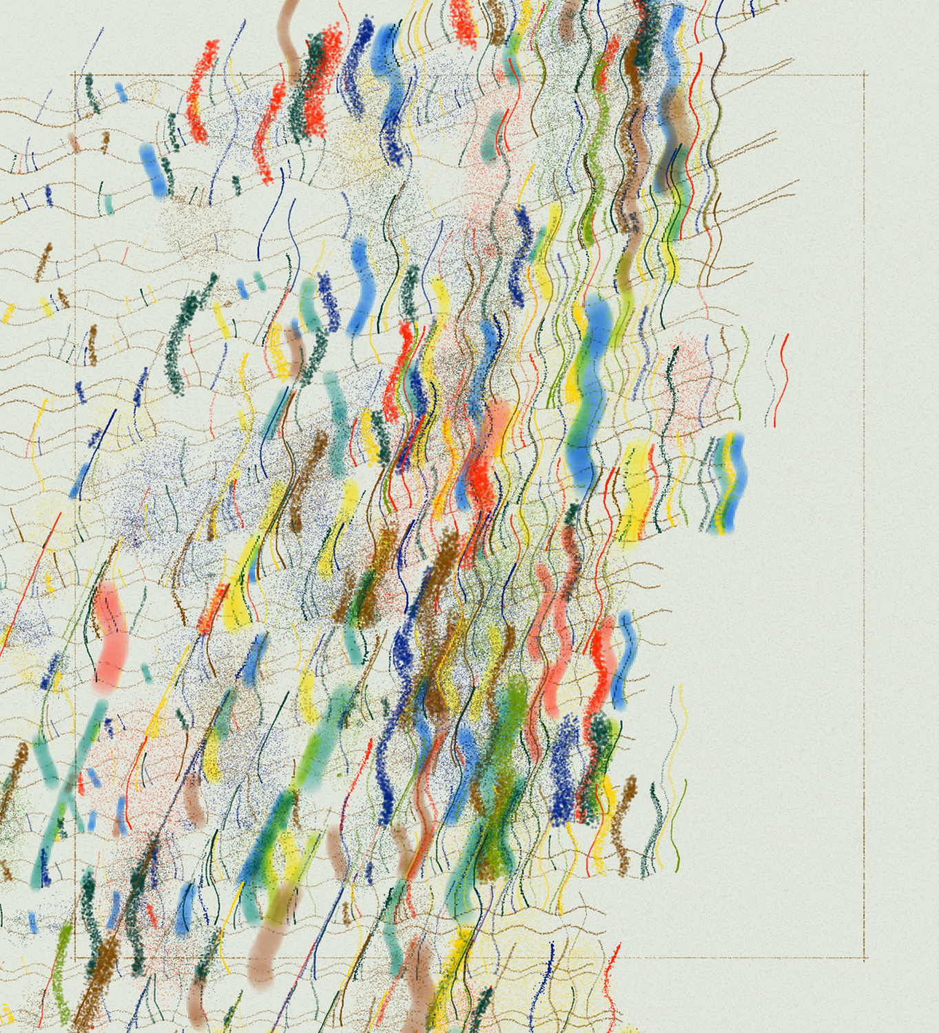 Enfantines I. Small Talk is the first of a set of algorithms that explore the basics of Generative Art, written with the aim of preparing artists for the script patterns of digital life. “Small Talk” experiments with grids, flow-fields, and brushes; all with a fresh, almost childish style.