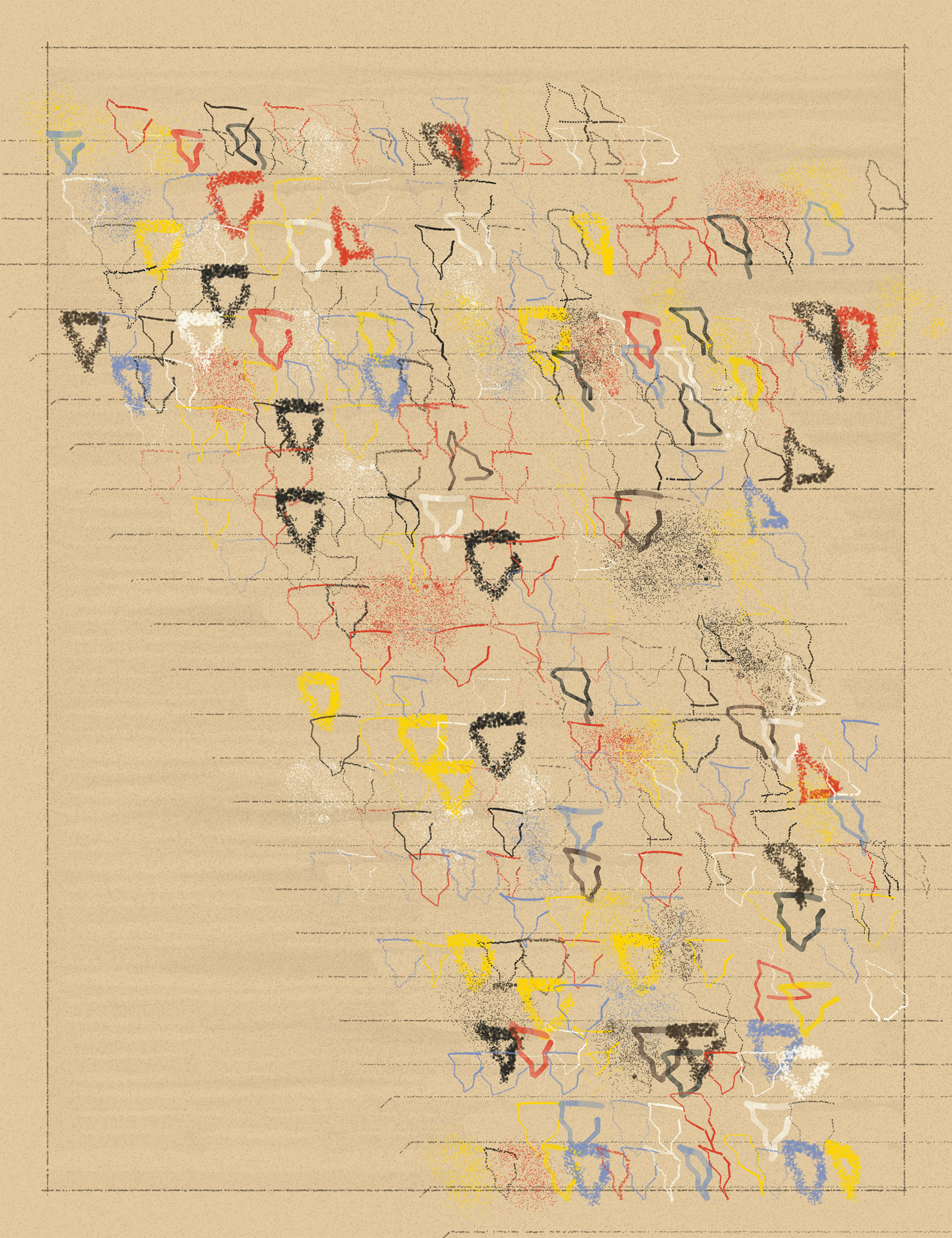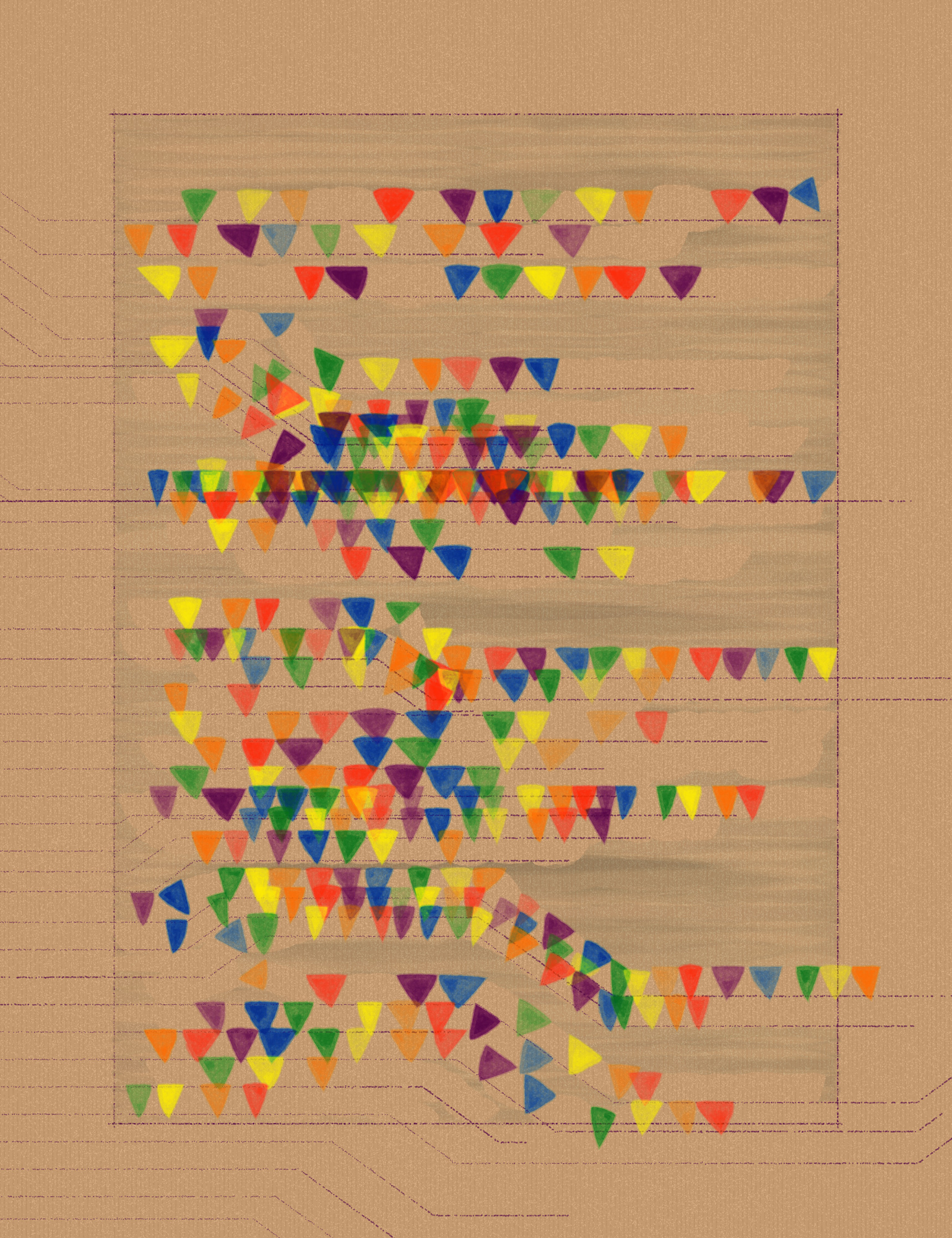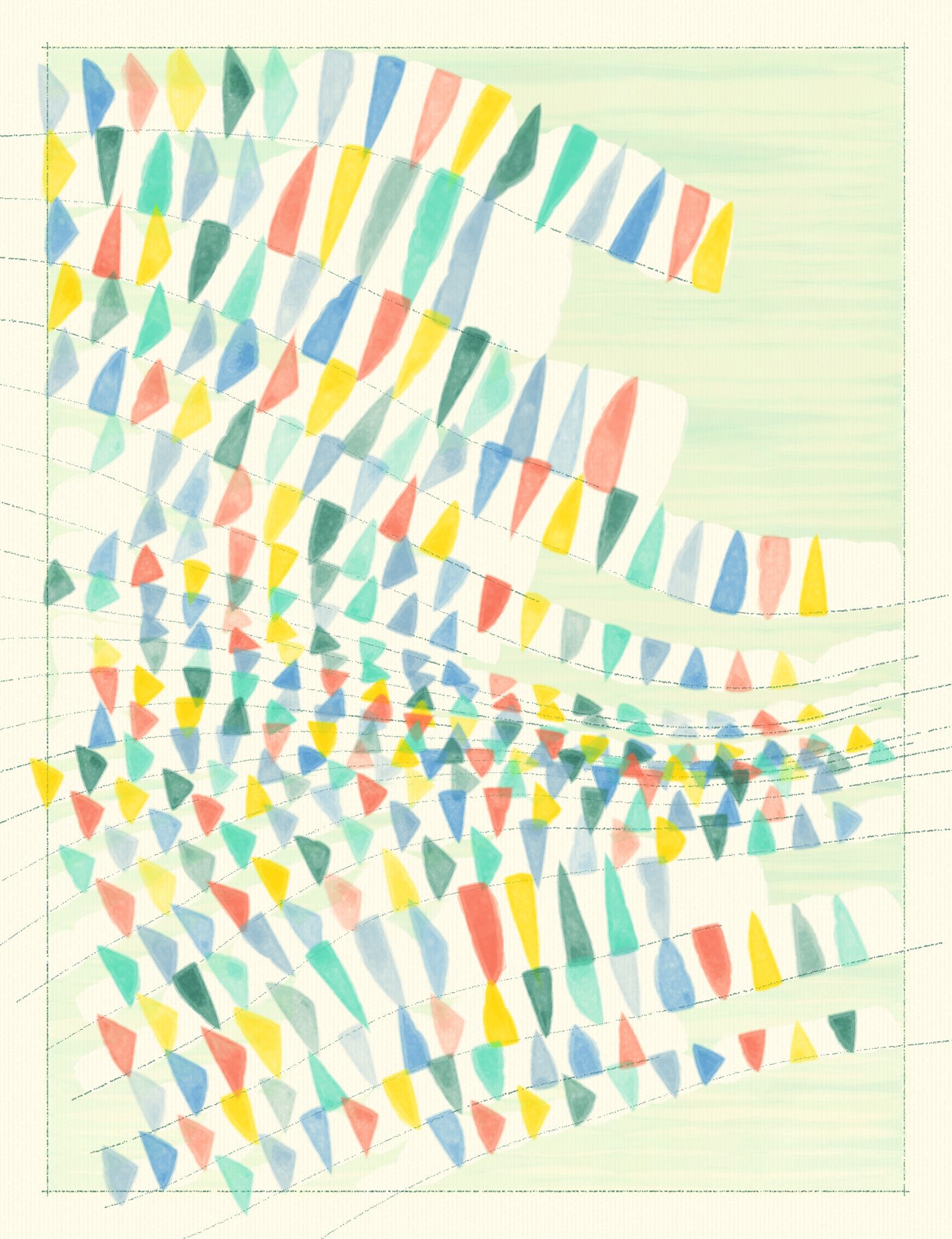 The artworks are fully composed by horizontal lines and simple shapes travelling through imperfect flow fields, offering a characteristically bright and cheerful aesthetic that is homage to both Erik Satie and Enric Miralles’s intellectual legacies. Fuga a Tientas is the coming-of-age of the Enfantines (fxhash, 2022) algorithm, still childlike but now a more sophisticated and yet imperfect exploration of form and counterform, sound and colour.