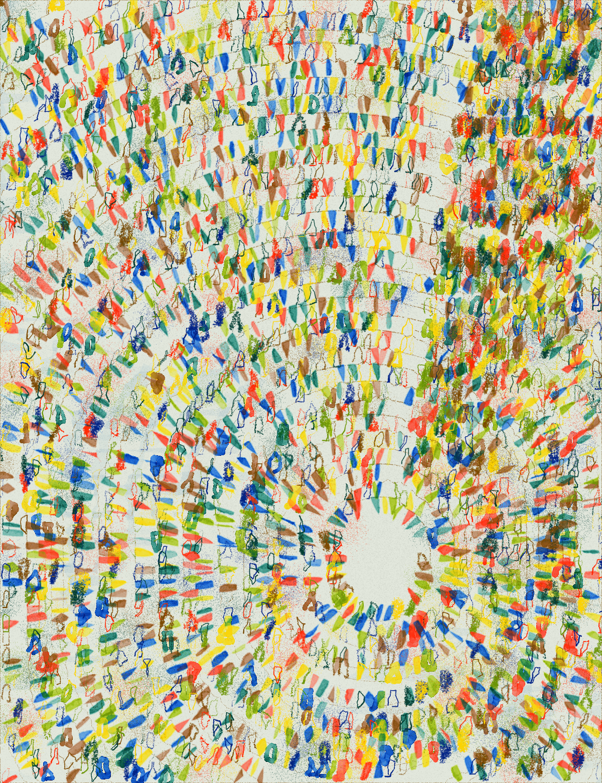 This Fuga a Tientas on Verse, 2023, explores how its form of writing, namely “coding”, can likewise be conceived as a form of sketching, or how unexpected shapes and colours emerge from simple geometric operations when imperfect repetition is celebrated.